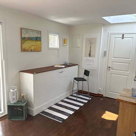 Modernt & vackert gästhus om ca 27 kvm. Vit pustad fasad varvas med cederträ. Egen uppfart och ingång från Aspvägen. Egen privat uteplats samt insynsskyddad trädgård. Entrén har ett nybyggt tak. Huset består av ett stort ljust rum med liten men praktik kokvrå. Dagsljuset över köket kommer in via stort takfönster. Sångskåp som ger extra plats. Bäddsoffa som rymmer två vuxna. Badrummet är rymligt och ljust med flera fönster samt stort takfönster. 5 stora garderober ger gott om plats, samt egen tvättmaskin. Rummet är nymålat och har golvvärme. ...