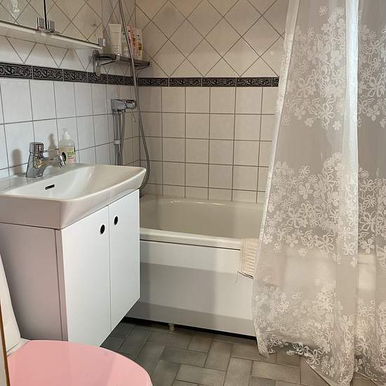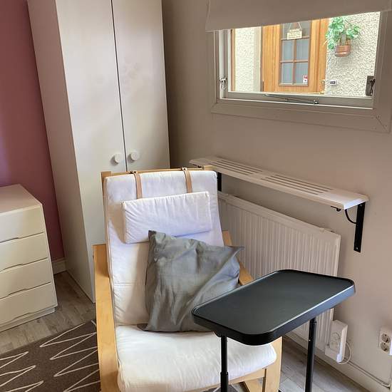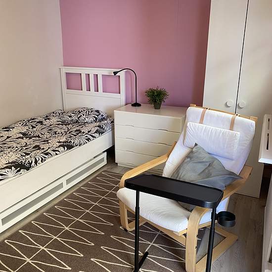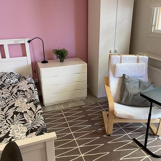 Möblerat rum (14 kvm) med egen ingång, uthyres till EN skötsam tjej/kvinna. Kyl/frys, mikro och vattenkokare finns på rummet, fullt utrustat kök finns i huset. Egen toalett, men badrum och tvättstuga är gemensamt i huset. Avståndet mellan rummet och ingången till stora huset är ca 2 meter och har en inglasad gång mellan, så du behöver inte gå i regn eller snö. Du får även tillgång till trädgården med bärbuskar och fruktträd, stor altan med grill och ett härligt poolområde i söderläge med uppvärmd pool (maj-september). De gemensamma ut...