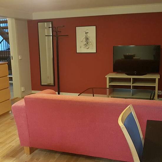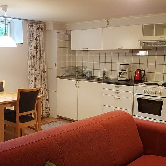 Rum på 22 m2 med två mindre fönster samt sovalkov på 8 m2. Rum+sovalkov ligger i källarplan till en villa, varför takhöjden är lite lägre (2,1 m). I rummet finns soffa, soffbord, TV, byrå, skrivbord, köksbord samt kök (diskbänk, spis med ugn, kyl/frys, mikro, samt porslin, kastruller mm. Köksfläkt med kolfilter, inget utsug). I sovalkoven finns säng, garderob och bokhylla. Du håller själv med täcke, kudde, sängkläder samt handdukar. Ingång via källardörr. Egen toa eller badrum finns inte, men du har tillgång till tvättstugan där toa, dusch o...