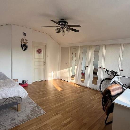 Ett stort 30m² rum finns tillgängligt i vår villa. Hyran är 6500kr omöblerad, och 7000kr möblerad (140cm säng, skrivbord och stol, sittsäck, garderober, stort privat förvaringsutrymme) Huset är rymligt (170 m²) och erbjuder gott om utrymme för alla hyresgäster. Vem bor här just nu: Jag och min 8-åriga dotter, vi använder dem två sovrum på bottenvåningen. Två internationella masterstudenter från Göteborg Universitet använder dem två mindre rum på övervåningen. Ditt rum är det största sovrummet på övervåningen. Faciliteter och gemensamma...