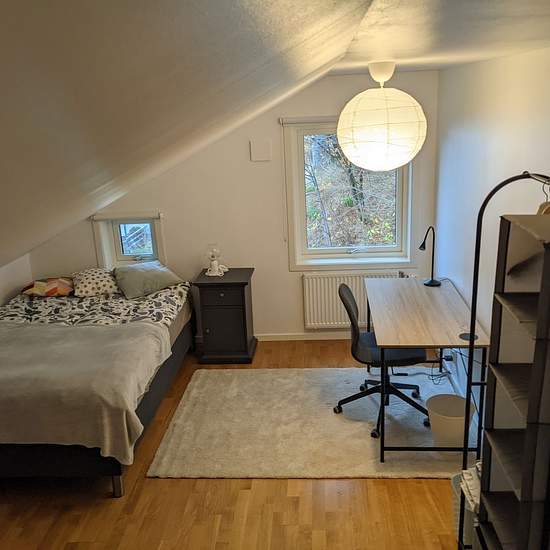 Ett 25m² rum finns tillgängligt i vår villa. Hyran är 6500kr möblerad (se bild). Huset är rymligt (170 m²) och erbjuder gott om utrymme för alla hyresgäster. Vem bor här just nu: Jag och min 9-åriga dotter använder dem två sovrum på bottenvåningen; och du får en av dem 2 mindre sovrum på andravåningen. Faciliteter och gemensamma utrymmen: *Nyrenoverat och fullt utrustat Öppet kök, samt en extra liten köksdel på övervåningen med brödrost, kylskåp, vattenkokare, kaffemaskin. *Badrum med dusch och bubbelbad. * Extra rum med toalett och t...