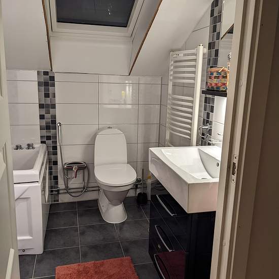 Ett 25m² rum finns tillgängligt i vår villa. Hyran är 6500kr möblerad (se bild). Huset är rymligt (170 m²) och erbjuder gott om utrymme för alla hyresgäster. Vem bor här just nu: Jag och min 9-åriga dotter använder dem två sovrum på bottenvåningen; och du får en av dem 2 mindre sovrum på andravåningen. Faciliteter och gemensamma utrymmen: *Nyrenoverat och fullt utrustat Öppet kök, samt en extra liten köksdel på övervåningen med brödrost, kylskåp, vattenkokare, kaffemaskin. *Badrum med dusch och bubbelbad. * Extra rum med toalett och t...