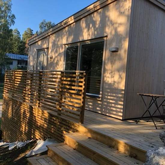 En inredd minivilla i ett familjärt lugnt bostadsområde. Det är ett Attefallshus med egen ingång. Det finns ett litet men komplett utrustat kök, matbord och två stolar, wc med dusch och tvättmaskin. Garderober i vardagsrummet och ny bäddsoffa (man kan ta med egen säng istället för soffan om man vill). Egen parkeringsplats vid huset. Utrymmet under boendet är vårt förråd. I hyran ingår normal el & vattenförbrukning, städning 1 gång per månad vid längre förhyrning, 1 parkeringsplats, pentrysopor och internet. Sortering för plast mm finns nere...