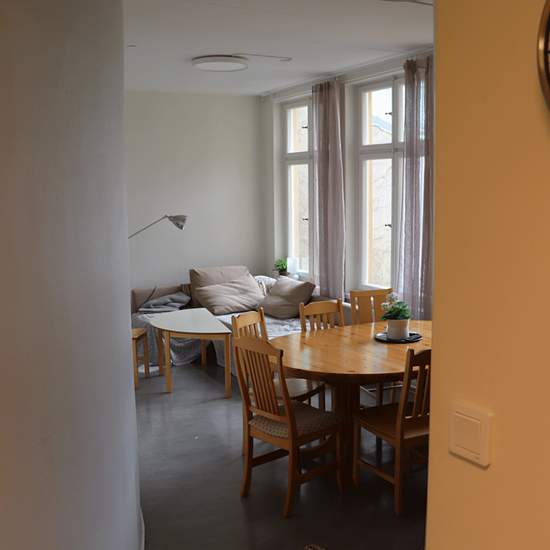 Studentrum på 18 kvm på plan 3. Delat kök med uppehållsrum tillsammans med 11 andra studentrum. Tvättstuga med tvättmaskin och torktumlare i anslutning till köket. Gemensamt uppehållsrum och bastu plan 5 Bokningsbart övernattningsrum/gästrum på plan 5