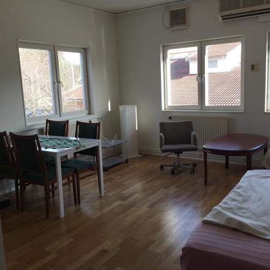 Norr om Stockholm för bilburen eller pendlare Ljus , delvis möblerad etta i öppen planlösning, 37 kvm, dusch, tvättstuga, tillgång till parkering och trädgård. Lägenheten ligger på andra våningen, söderläge,hiss, utan insyn. Hundra meter till station Åkers Runö med tåg eller buss mot Östra Station i Stockholm där T-bana finns. Tar ca 35 minuter, stannar bl a i Täby, Mörby, Danderyd. Närhet till strövområden och service. För en eller två personer hyra 7.600 kr per månad inklusive el, värme och vatten. Uthyres året ut med möjlighet till förl...