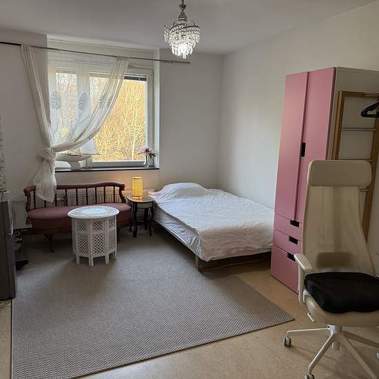 Rum uthyres: Stort, ljust och möblerat rum i Hägstra med vacker utsikt mot skogen. Endast 9 minuters promenad till tågstationen, nära Älvsjöbadet och med buss 143 till Älvsjö station runt hörnet. Rummet är fullt utrustat med säng, garderob, sovbord, TV, litet kylskåp och skrivbord. Hyran inkluderar el, bredband och tillgång till tvättstuga. Perfekt för dig som söker ett lugnt och bekvämt boende med närhet till natur och kommunikationer. Gärna till en kvinna som jobbar eller pluggar , Serviceavgift för hyresgäst: 327