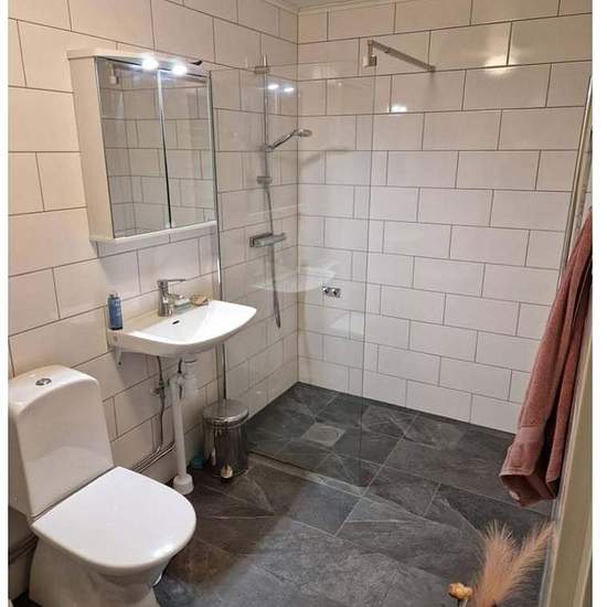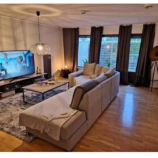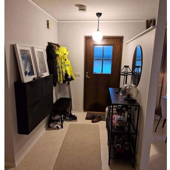 Ingång till lägenheten genom egen yttredörr som leder in till en stor hall med goda förvaringsmöjligheter. Kök och vardagsrum ligger i anslutning till varandra. I andra halvan av lägenheten finns två sovrum som delas av med toalett mellan. Lägenheten är väldigt rymlig, har stora fönsterpartier och bjuder på en härlig atmosfär. Lägenheten har en öppen planlösning och bra rumsindelning. Merparten av lägenhetens rum har fönster mot söder vilket skapar ett härligt ljus i lägenheten. Lägenheten ligger på bottenplan med egen uteplats. Tvättmöjligh...