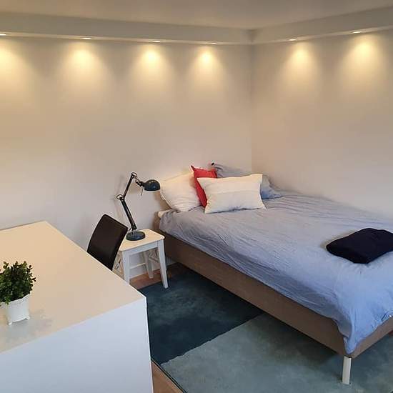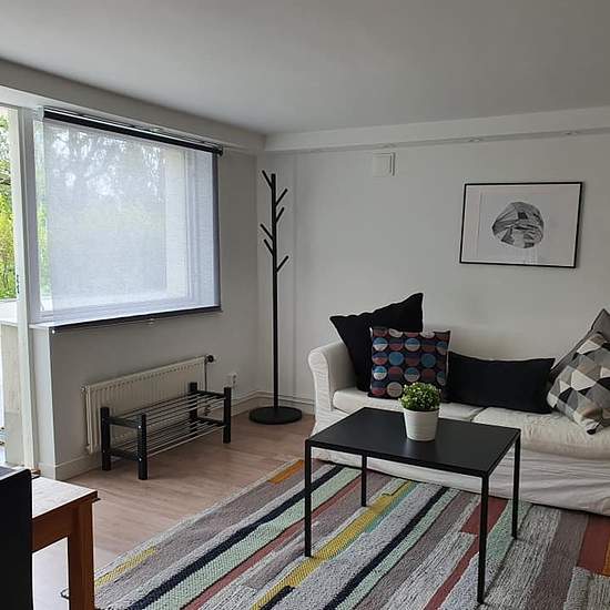 One bedroom, a living room and a kitchen. Unfurnished. Small but well planned flat, 48mts2 Wifi, electricity and rubbish collection included. Possibility to park if needed. Washing machine, available in the flat. 12 min walk from Mörby Centrum, red line.