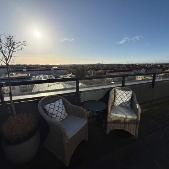 Möjligt att hyra depositionsfritt genom Samtrygg. Månadskostnad: 13800 kr. ______________________________________________________ Snabbast bokar du visning genom att följa denna länk till Samtrygg: Här hittar du även fler bilder och mer info. ______________________________________________________ På 8:e våningen ligger denna studiolägenhet (uthyrningsdel). Fullt möblerad och utrustad. Lägenheten har milsvid utsikt och är insynsskyddad. Pricken över i är del av en fantastik takterrass i söderläge. Terrassen som hör till är cirka 20 kvm var...
