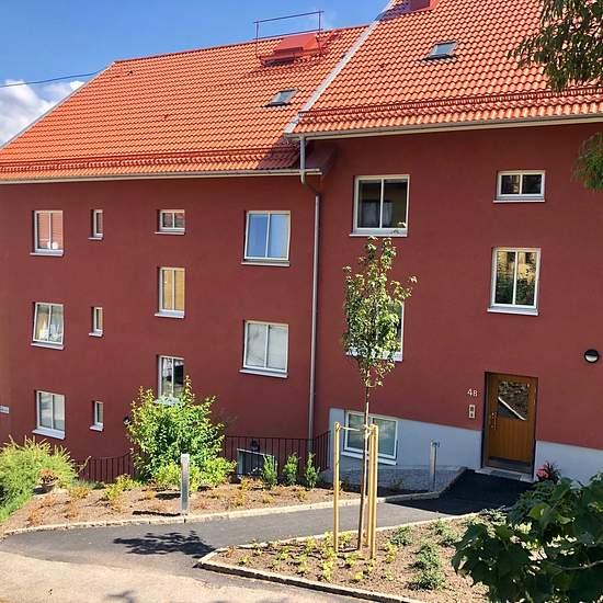 Etta på markplan med egen ingång (En av de vita dörrarna på gaveln i bild 1). Här bor du med närhet till både natur och service. Strax nedanför huset hittar du Danska vägen som är fylld med butiker, restauranger och caféer. Från hållplatsen utanför går bussarna ofta och på 10 minuter tar du dig till Göteborgs centralstation. I närheten finns också grönområden som Skatås och Delsjön och på husets baksida finns grillplats och sittplatser. 2019 genomförde vi en total ombyggnad av fastigheten och lägenheterna är i nyskick. Huset är rökfritt o...