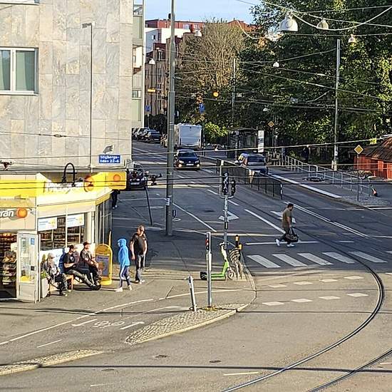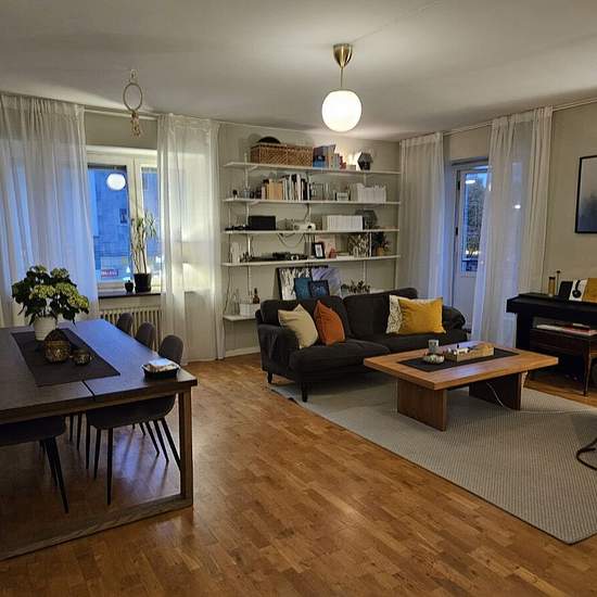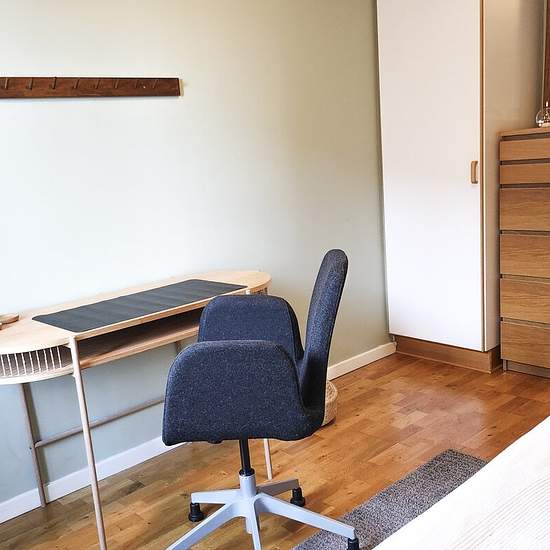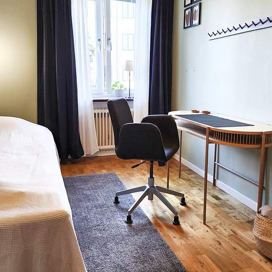 With the tram stop right outside, Stigbergstorget in Majorna, and with good communications to central Gothenburg. The travel to Brunnsparken (where most other trams stop) is around 10 minutes. At Stigbergstorget you'll find cafes, restaurants, rental bikes, a grocery store across the street, and a second hand shop in the same building. The room for rent, the green room, fully furnished with: - A single bed with a bedside table. - Desk with office chair and rubbish bin. - Hooks above desk. - Two closets, one with shelves and one for hang...