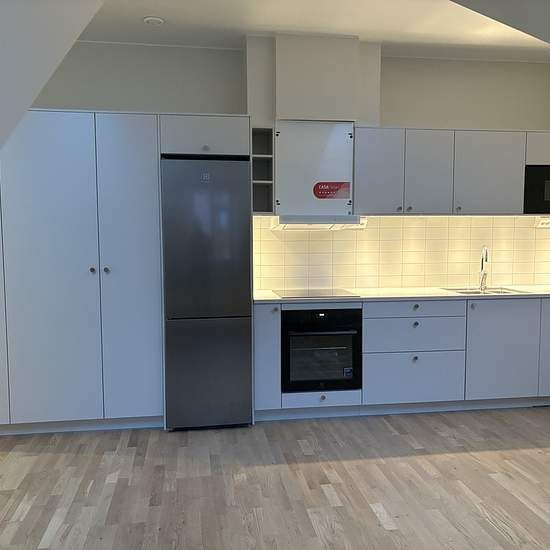 Nybyggd vindslägenhet med öppen planlösning mellan kök och vardagsrum. Kök från Ballingslöv, bänkskiva i silestone, inbyggnads ugn, mikro samt diskmaskin. Fristående kyl/frys. Induktions häll. Takfönster. Genomgående parkettgolv. Bra med förvaring. Helkaklat badrum med el-värmegolv, duschväggar av glas, kommod under handfat och eluppvärmd handdukstork. Planritningen kan innehålla avvikelser från verkligheten. Ett fantastiskt boende står redo för en ny hyresgäst.
