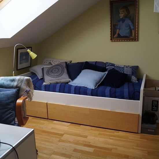 Ett trivsamt och möblerat vindsrum på ca 12 kvm uthyres i min charmiga etagelägenhet i centrala Aspudden. Perfekt läge med nära till tunnelbana och Aspuddens centrum, Vintervikens grönområden vid Mälaren och Södermalm. Om rummet • Ca 12 kvm, ljust och mysigt vindsrum • Möblerat med säng, skrivbord med stol, bokhyllor och garderob • Eget badrum intill rummet • Tillgång till dusch i större badrum på entréplan • Tillgång till gemensam trädgård/uteplats i söder på husets baksida • Tillgång till cykelrum, tvättstuga och bastu i källarplan Kök...
