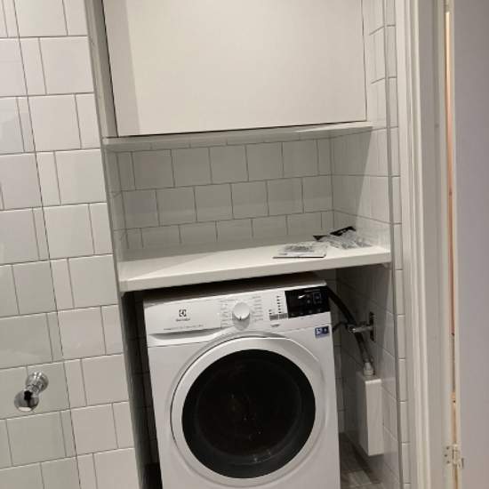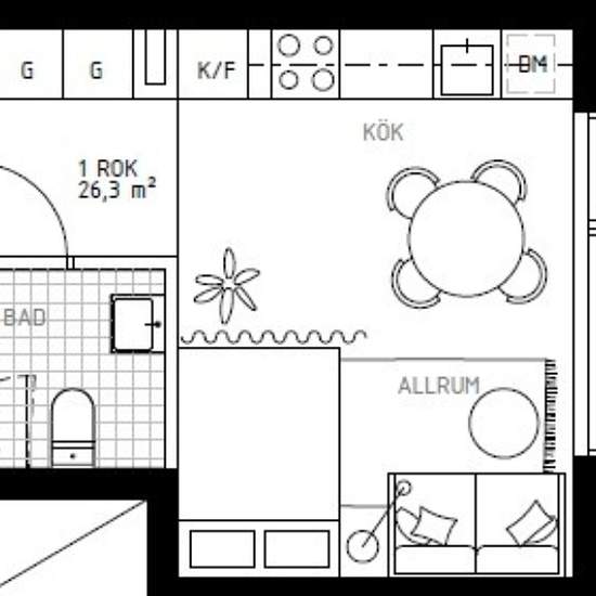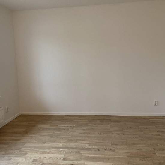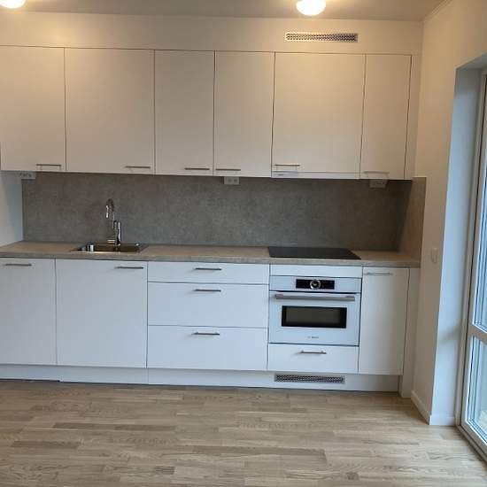 BADRUM Helkaklat badrum med svart klinker på golv och vitt matt kakel på vägg. Utrustat med WC, tvättställ med kommod, spegel med belysning, duschvägg i klarglas samt tvättmaskin och torktumlare med arbetsbänk ovan. KÖK Exklusivt och stilrent med med skåpluckor och lådfronter i vit kulör samt arbetsbänk i grått utförande. Den maskinella utrustningen består av induktionshäll, ugn, integrerad diskmaskin samt integrerad kombinerad kyl/frys. Parkett på golvet och vitmålade väggar. SOVALKOV Rymlig sovalkov med plats för säng. Stort...