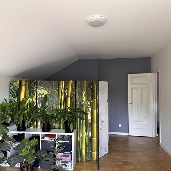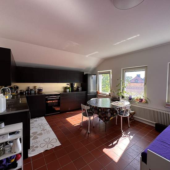 Bostaden kan även hyras ut för kortare period 3 månader eller längre Bostaden hyrs ut omöblerad enligt överenskommelse. Möbler kan ingå, lädersoffa, matbord, stolar, mattor, väggskärmar - om hyresgästen vill ha dessa i bostaden. Parkeringsplats för bil ingår i månadsavgiften. El, Bredband, Värme ingår i månadsavgiften. Ljus bostad högst upp i byggnaden, 3 trappor utan hiss. Bostaden ligger högst upp i ett vindsplan, inga grannar varken bredvid eller ovan, insynsskyddad. Fri utsikt över Tomtebergaskolan. Rumsbeskrivning Hall: Säkerhet...