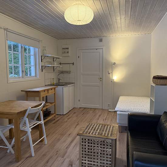 OBS VV LÄS DETTA: Om du är intresserad var vänlig skriv en kort text om dig själv, varför du söker boende och för hur lång tid. Vi svarar alla som vi tror är en lämplig matchning. Om annonsen är kvar finns bostaden kvar till uthyrning. Min fru och jag hyr ut en möblerad lägenhet i ett fristående hus på vår tomt. Ca 20m2, nytt pentrykök, nytt golv, nyligen renoverat badrum med dusch och tvättmaskin. Pentrykök. Lägenheten är tillgänglig fr.o.m. 1a februari och vi hyr helst ut en längre tid. Lägenheten ligger i ett mysigt, lummigt villaområde...