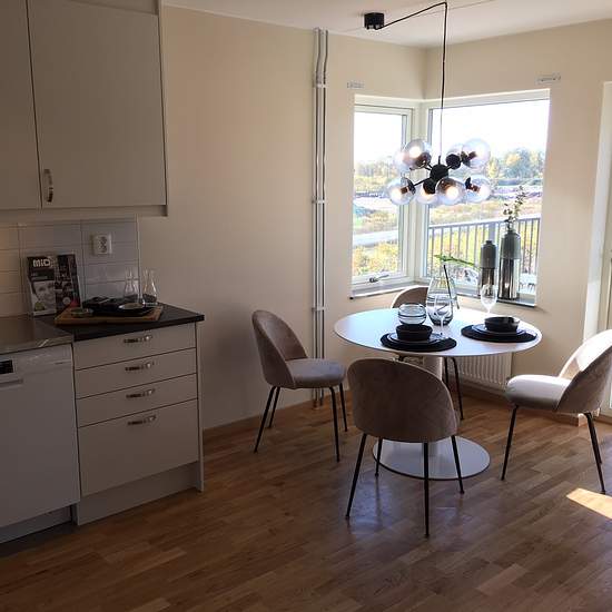 Väldigt fin och ljus mindre lägenhet med fina materialval. Vitmålade väggar med genomgående ekparkett och balkong. Helkaklat badrum med handdukstork. Fint kök med diskmaskin och spis med keramikhäll. Gemensam tvättstuga