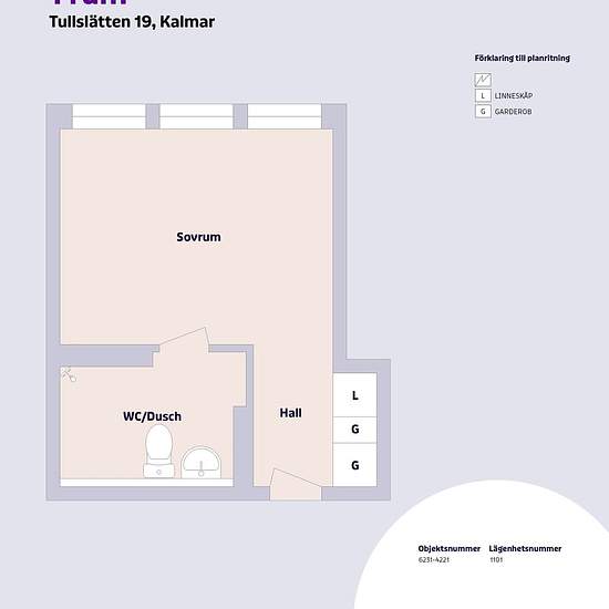 Studentrum på Tullslätten 19 Kalmar. Tullslätten ligger med gångavstånd till Kalmars stadskärna med affärer och restauranger samt Kalmar centralstation. Här har du även närhet till Kalmarsundsparken och stadens centrala badplatser. Studentrummet har en öppen planlösning. Allrum med plats för säng och övrigt möblemang samt en mindre hall med klädupphängning och förvaringsmöjligheter. Badrummet är utrustat med wc, handfat, badrumsskåp, handdukstork, spegel och dusch. Tvättstuga och miljöhus ligger på gården. Hiss finns från entréplan. Rummet l...