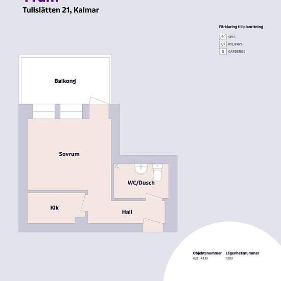 Studentrum på Tullslätten 21 Kalmar. Tullslätten ligger med gångavstånd till Kalmars stadskärna med affärer och restauranger samt Kalmar centralstation. Här har du även närhet till Kalmarsundsparken och stadens centrala badplatser. Studentrummet har en öppen planlösning. Allrum med plats för säng och övrigt möblemang samt en mindre hall med klädupphängning och förvaringsmöjligheter. Badrummet är utrustat med wc, handfat, badrumsskåp, handdukstork, spegel och dusch. Rummet har en balkong. Tvättstuga och miljöhus ligger på gården. Hiss finns f...