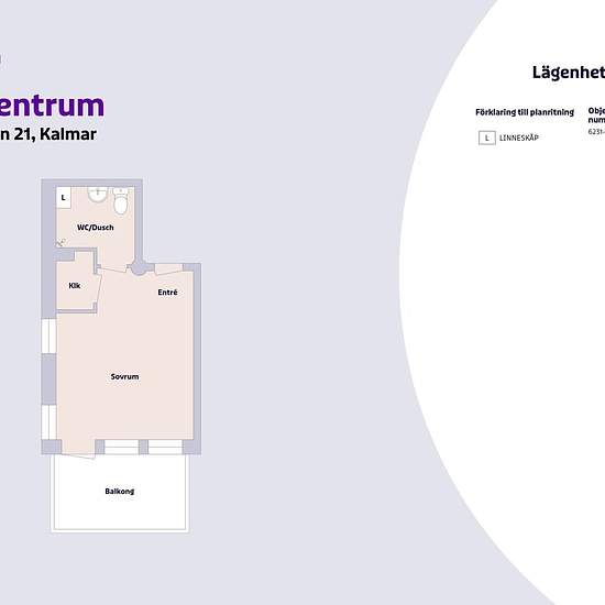 Studentrum på Tullslätten 21 Kalmar. Tullslätten ligger med gångavstånd till Kalmars stadskärna med affärer och restauranger samt Kalmar centralstation. Här har du även närhet till Kalmarsundsparken och stadens centrala badplatser. Studentrummet har en öppen planlösning. Allrum med plats för säng och övrigt möblemang samt klädupphängning och förvaringsmöjligheter. Badrummet är utrustat med wc, handfat, badrumsskåp, handdukstork, spegel och dusch. Rummet har balkong Tvättstuga och miljöhus ligger på gården. Hiss finns från entréplan. Rummet l...