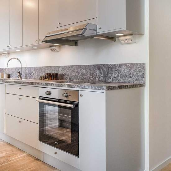 Bostad Svanenmärkta hyresbostäder uppförda under 2023. Välplanerade och öppna planlösningar med gott om ljusinsläpp. Vi har valt ut färger, material och detaljer som gör det lätt att skapa en egen och personlig känsla. Köken som går i en grön eller beige kulör kommer från Vedum och är utrustade med diskmaskin, ugn och induktionshäll. Alla vitvaror kommer i rostfritt utförande. De större badrummen är utrustade med separat tvättmaskin och torktumlare, och de mindre lägenheterna med en kombinerad tvättmaskin. Vit kommod med en rund LED-spegel...