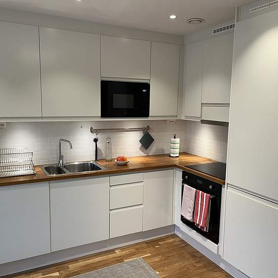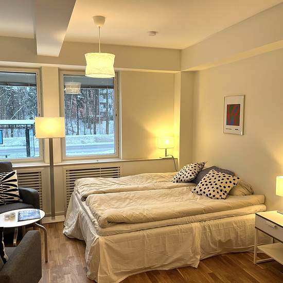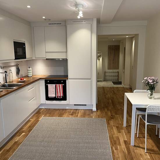 Exklusiv, nyrenoverad och nymöblerad 1:a med öppen planlösning och öppet kök. I lägenheten finns 2 fåtöljer och ett kaffebord, matplats/arbetsplats för 2 personer samt sovavdelning. Bostaden är genomgående målad i vitt och på golven ligger parkett och marmor. Köksdelen smälter snyggt in med sina vita fronter och integrerade vitvaror. Badrummet är sobert med helkaklade vita väggar och duschen är stor och bekväm. Strax intill, i den inre hallen, finns en stor inbyggd garderob och det finns även ett separat rum för förvaring. Hyra inkluderar...