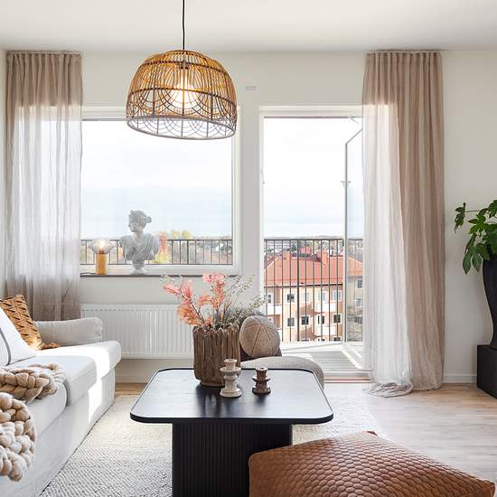 Lägenheten är nybyggd och är smakfullt inredd med trägolv av vit mattlackad ek och ljusmålade väggar. Det här är ett smart planerat boende med all standard som behövs för ett bekvämt boende. Köken är vackert skogsgröna och utrustade med spishäll, ugn, mikro och kombinerad kyl/frys. Badrummen har vitt kakel, ljusgrå klinker och en kommod i sandbeige kulör. I fastigheten finns en välutrustad tvättstuga med tvättmaskin, torktumlare, torkskåp, mangel och diskbänk. I bottenvåningen finns också ett generöst cykelrum med verkstadsplats. Det finns m...