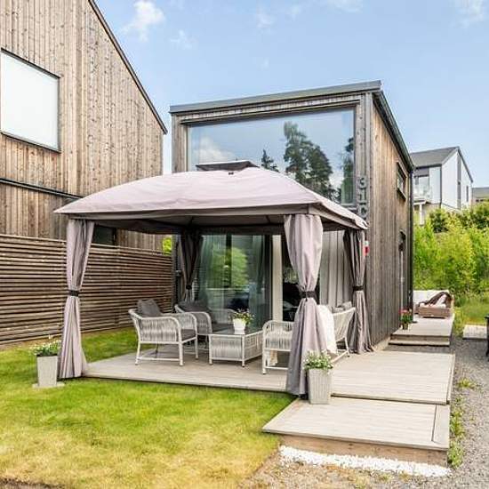 Fristående minivilla i skandinavisk design mitt i villaidyllen Länna. Ljust och lugnt belägen på en tomt med privat och och insynsskyddat läge. Huset har en attraktiv planlösning med genomgående ljusa ytskikt och härlig atmosfär av det ljusa sällskapsrummet öppet mot köket med matplatsdel. Stora fönsterpartier för ett enastående ljusinsläpp gör detta till bostadens centrala plats med utgång till altanen på husets framsida. Vidare nås den plana trädgårdstomten i härligt söderläge och avskilt hörnläge samt ytterligare en trädäckad altan. Gene...