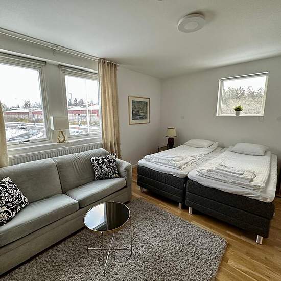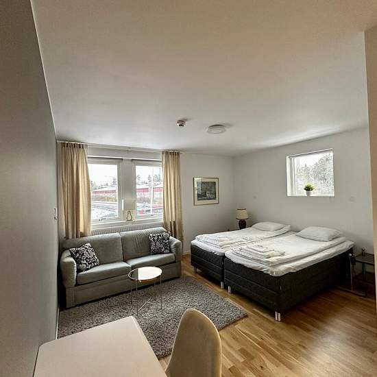Välkommen till Sollentuna Aparthotel Business Studio 107 – en stilren hörnlägenhet med L-formad planlösning, ljusinsläpp från öst och söder och ett lugnt läge nära Fasanvikens strand. Ett perfekt premiumboende för affärsresenärer, konsulter och veckopendlare som vill ha ett färdigt “ready-to-live” boende med service inkluderad. OM BOSTADEN • L-format planlösning med tydlig sov-, arbets- och vardagsdel • Lyxig ställbar säng med fjärrkontroll • Sittgrupp med bäddsoffa och matplats • Höj- och sänkbart skrivbord – idealiskt för remote work • F...