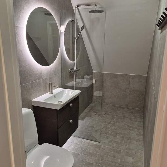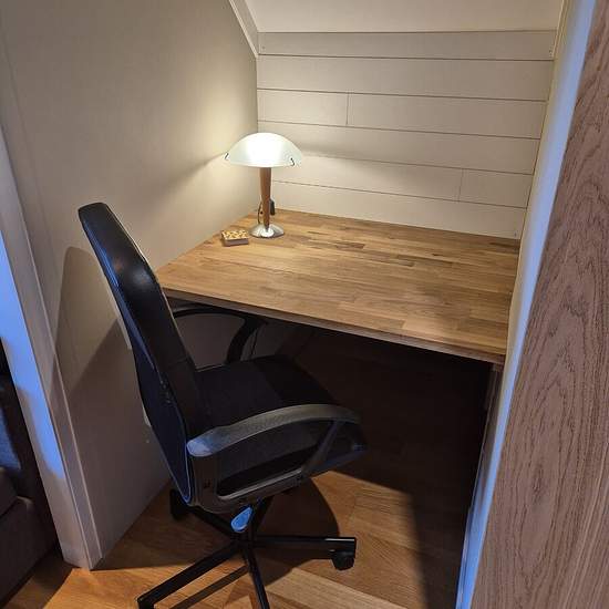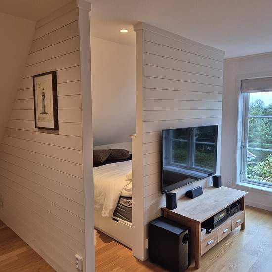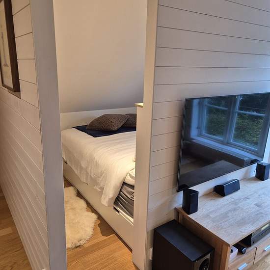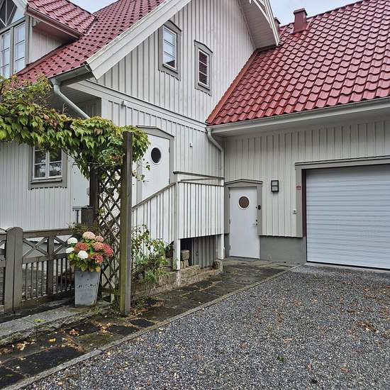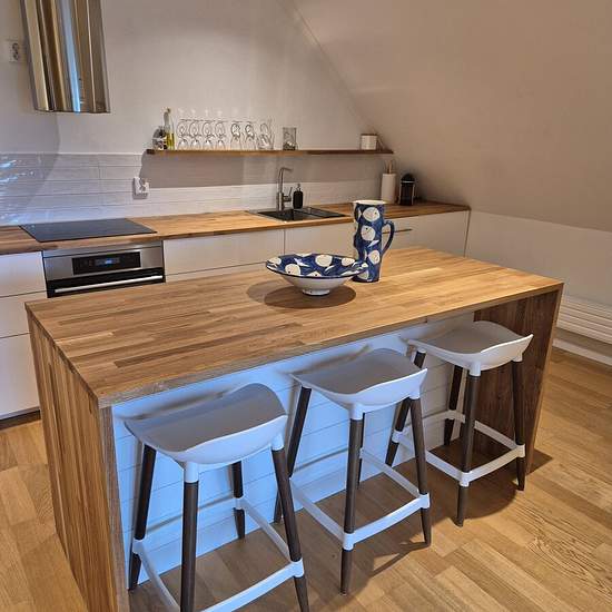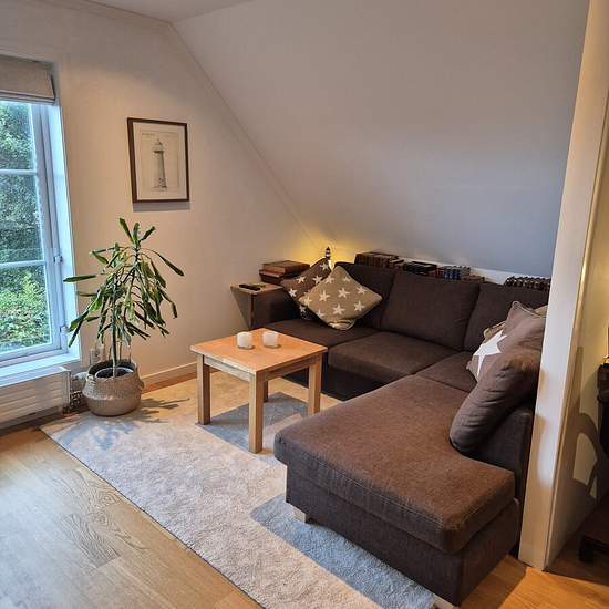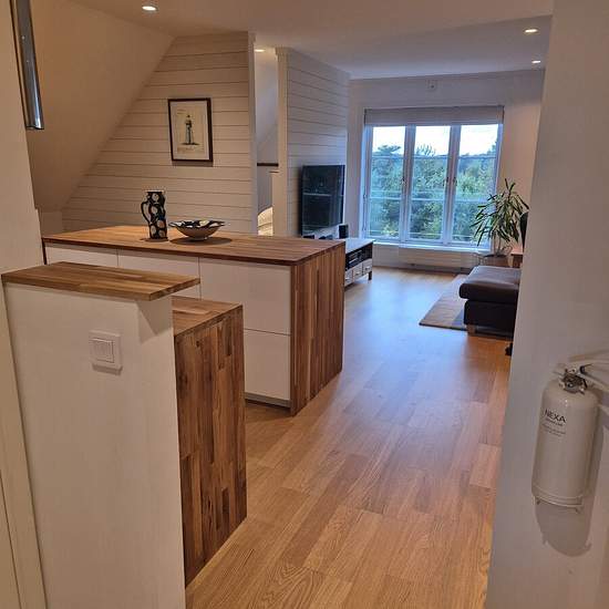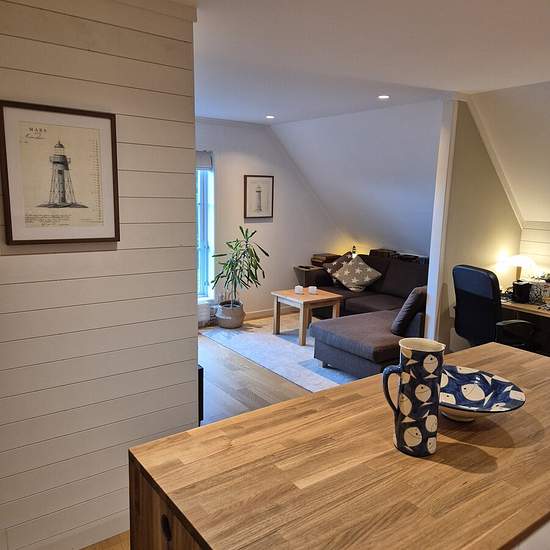 En ljus och trevlig vindsvåning med havsutsikt som ligger ovanför ett privat garage. Den erbjuder ett bekvämt och modernt boende med en välkomnande hall på markplan och en trappa som leder upp till resten av lägenheten. I hallen finns en kombinerad tvätt- och torkmaskin samt förvaring för skor och ytterkläder. Övervåningen har en öppen planlösning med en köksdel, skrivhörna, vardagsrumsdel samt sovalkov. Köket är välutrustat med disko, diskmaskin, kyl/frys, kombiugn/mikrovågsugn, induktionshäll och Nespresso-kaffemaskin samt en stor köksö...