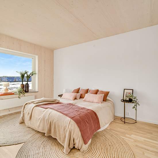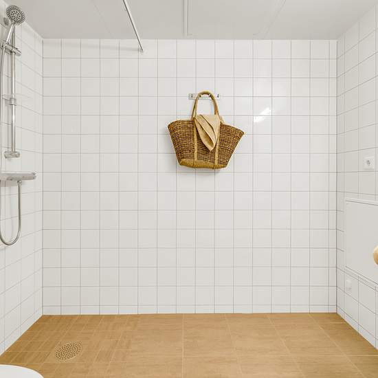Entréhallen har ett praktiskt klinkergolv medan de andra rummen har en ljus, vitlaserad trestavsekparkett. Köket är sobert färgsatt med släta, vita luckor och dörrar med köksbänk och stänkskiva av tåligt laminat. Vitvarorna kommer från Electrolux eller likvärdigt varumärke. Fönster och fönsterdörrar har treglas med fönsterbänkar i vacker natursten. Innerdörrar och garderober är vita för att harmonisera med de fräscha, vita innerväggarna som ger en perfekt canvas för dig som vill skapa ditt egna drömboende. Badrummen är välutrustade med wc, d...