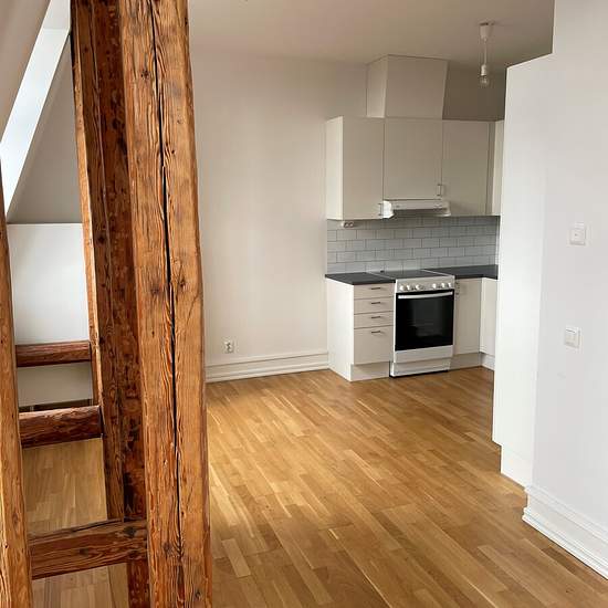 1.5 rum och kök uthyres, mitt i centrum, på Nygatan 13 B i Trelleborg. Fastigheten är över 100 år gammal, och uppfördes som skola, för att år 2016 byggas om till hyreslägenheter. Lägenheten är belägen 2 trappor upp, på plan 3, hiss finns. Sovalkov, dvs. plats för standardsäng. ("sovrummet" är mindre i verkligheten än på ritningen). Ekparkett i hall, sovrum samt vardagsrum. Helkaklat badrum. I hyran ingår värme, varmvatten, fiber-tv (basutbud) samt el (elen ingår med 200 kr/mån, förbrukar man mer så får man betala mer, och förbrukar man mindr...