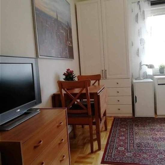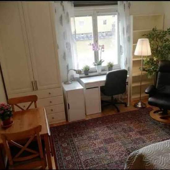 Det är en separat del av min lägenhet med egen ingång, som en liten lägenhet. Den är ca 20 m2. Jag hyr ut den möblerad. Det ingår bredband, el, vatten, värme, förråd i hyran. Mot en liten avgift kan hyresgästen även få tillgång till gymmet i källaren och bastun. Det finns även övernattning rum.