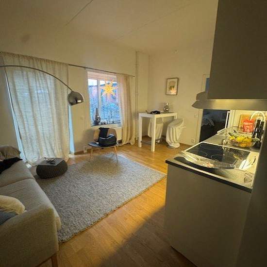 Jag hyr ut min lägenhet på grund av ett annat jobb. En liten tvåa med stort altan, jättemysig. Möblerad – se bilder. Privata saker kommer jag att ta med mig. Säng, soffa, matta samt kökssaker för två personer ingår. Tågstationen ligger 15 minuter bort att promenera och bussen 2 minuter bort. Väldigt nära stan. Från stationen till Arlanda tar det 20 minuter med tåg, och tågen går var 15–20:e minut. Serviceavgift för hyresgäst: 485
