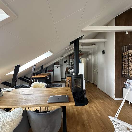 Cozy attic apartment with a fireplace located at Västra Ringvägen 21 Västerås: 10-12 min walk from the central station. Rent includes: hot and cold water, internet, heating. Serviceavgift för hyresgäst: 490