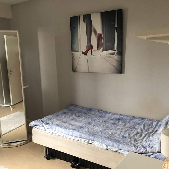 Rent och prydligt rum som är möblerat med säng och sängbord, stor spegel som går att snurra på och bakom finns hyllor och skåp. Det finns ett klädställ också samt datorbord och stol om behov finns. Serviceavgift för hyresgäst: 222