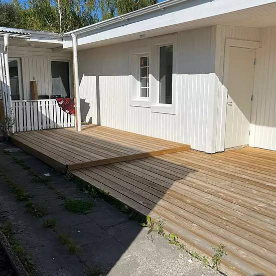 Beskrivning En-plansvilla med diskret ingång från bakgården och egen gate, carport och stor terass