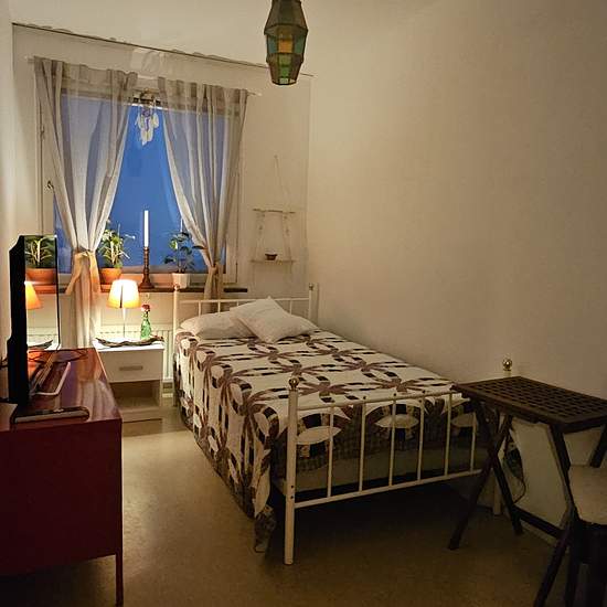 Rum i Huddinge centrum väldig nära Capus Flemingsberg ,Södertörns Högskola Karolinska Institut Huddinge ,Samt Direkt tåg till Odenplan station till Karolinska i Solna . Möblerat rum . Fin utsikt ,inglasad balkong ,kvällssol ,2 hissar ,Tillgång till tvättstuga . I lägenheten som har 3 sovrum ,vardagsrum ,badrum och kök bor 2 katter och en vuxen kvinna på 61 år som arbetar på sjukhus nattetid .