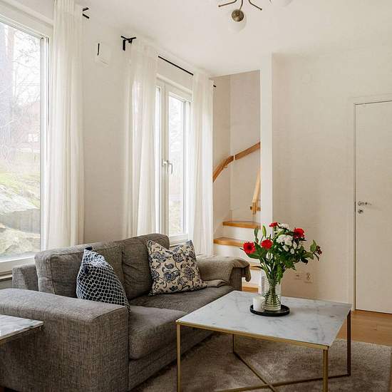 Modern and well-planned 2-room apartment (49 sqm) in Björknäs, Saltsjö-Boo, built in 2021. The apartment has its own entrance and a corner location, giving it a bright and private feel more similar to a small townhouse than a typical apartment. The ground floor offers an open layout between the kitchen and living room, with good storage, dishwasher, and space for both dining area and sofa. The bathroom is fully tiled and equipped with a combined washer/dryer. Waterborne underfloor heating throughout ensures a comfortable indoor climate year...