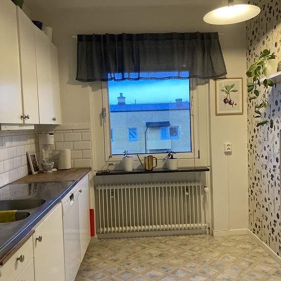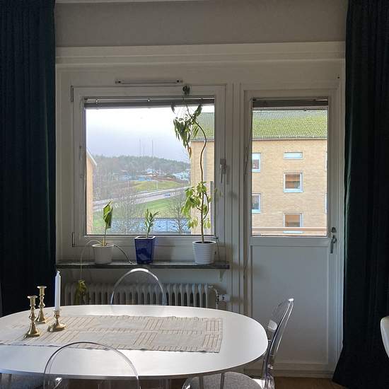 2 rok. Ljus hall med bra förvaring. Kök med diskmaskin, finns plats för mindre köksbord. Goda förvaringsmöjligheter för porslin, varor, husgeråd mm. Mörkt stort sovrum. Inbyggd garderob. Badrum med dusch och tvättmaskin. Stort vardagsrum med plats för soffa och matbord. Balkong med eftermiddagssol. Lägenheten ligger på tredje våning, längst upp. Hiss finns ej. Lägenheten ligger två rondeller ifrån E20 och det tar ca 5 minuter att gå till kollektivtrafiken. Det tar ca 30-40 minuter till Göteborg. Goda förbindelser med tåg, både pende...