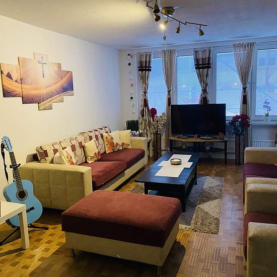 stor lägenhet på 100 kVm om 4 rum. Du kommer att ha tillgång till 1 sovrum eller 2 sovrum (beroende på behov). Ägs av en familj som reser utomlands, så upplägget är hemtrevligt. Stort kök med all utrustning och köksredskap och vitvaror. 1 stort badrum med toalett och dusch. 1 gästtoalett. Balkong och byggnad är nyligen renoverad. Tvättmaskin och torktumlare är lägenhet, så du behöver inte använda allmän tvättstuga i byggnaden Serviceavgift för hyresgäst: 630