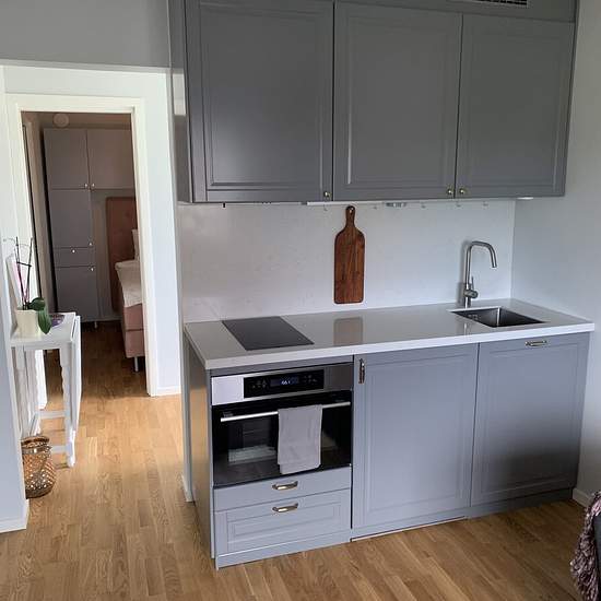 Nyrenoverad lägenhet i villa med egen ingång och uteplats. Hall med garderober, ett sovrum med förvaringsmöjligheter, badrum med tvättmaskin och torktumlare samt kök/vardagsrum. I hyran ingår värme och vatten. Den ligger i ett lugnt villaområde med närhet till bussar till både pendeltåg och tunnelbana. Uthyres till en skötsam hyresgäst med fast anställning. Inga fester eller övernattande gäster är tillåtna, inte heller rökning eller husdjur. Serviceavgift för hyresgäst: 535