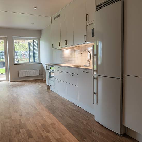 Välkommen till ett hem som bjuder på både stil och funktion. Här får du en modern lägenhet med tydlig radhuskänsla och en rymlig uteplats på hela 19 kvm – perfekt för sommarkvällar, odling eller en lugn morgonkaffe i solen. Den öppna planlösningen ger ett socialt och luftigt hem där stora fönsterpartier släpper in rikligt med ljus. Köket från Marbodal är smakfullt utformat med kvalitativa vitvaror från Electrolux, vilket skapar en både snygg och praktisk matlagningsmiljö. I det helkaklade badrummet finns en egen tvättstugedel med tvättmaski...