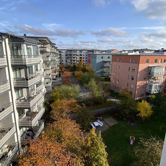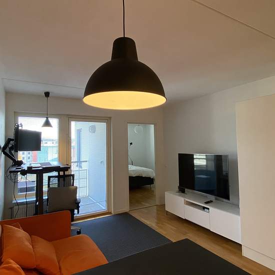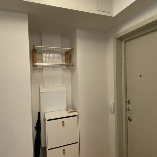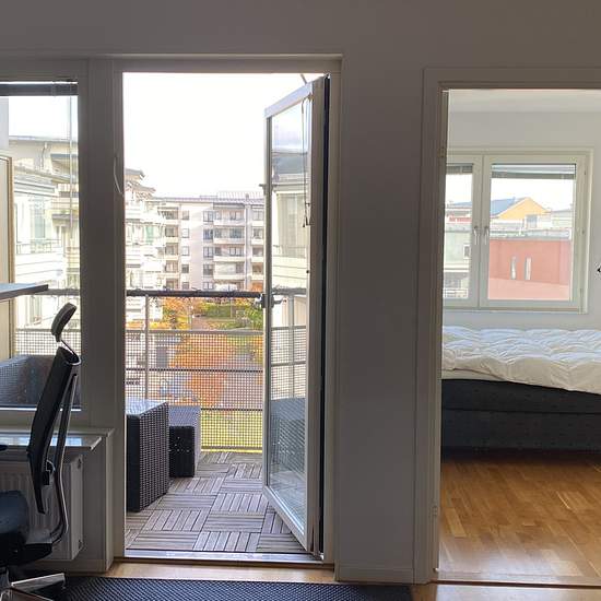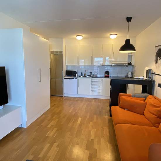 40m² apartment near Blåsut station (50m walk). Located on the 6th floor with elevator access. The apartment has one bedroom, and an open-plan living room with kitchen. Apartment also includes small furnished balcony. The apartment comes furnished, but you're welcome to bring your own furniture if you prefer. The desk has been moved to the bedroom (next to the window), creating more space in the living room. You'll find storage space with closets in both the bedroom and living room. All the practical stuff is here - washing machine, dryer, a...