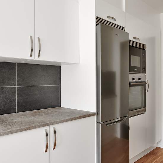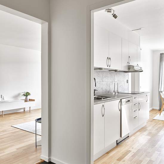 Välkommen till en renoverad 2 RoK med genomgående hög och modern standard. HALL Välkomnade hall med svart entrébeläggning, vita väggar och golv i trälaminat - lägenheten har säkerhetsdörr. KÖK Modernt kök med rostfria vitvaror, antracitgråa bänkskivor och induktionshäll. Luckorna är vita med stilrena stålhandtag. Köket är utrustat med kyl/frys, varmluftsugn, fläkt samt diskmaskin och integrerad mikrovågsugn. BADRUM Lägenheten har ett, ljust helkaklat badrum utrustat med dusch, handdukstork, golvvärme, handfat med kommod samt spegelskåp m...