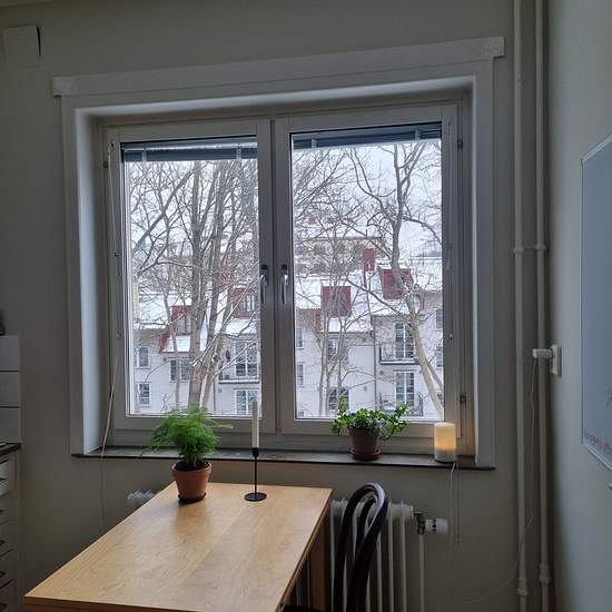 Två rum och kök som präglas av rymd och ljus tack vare fönster i två väderstreck och läget högt uppe på berget. Lägenheten är belägen på våning ett, men med högt läge vilket innebär att det är insynsfritt. Lägenheten är belägen i ett tyst och lugnt område med supertrevliga grannar. Slottskogen ligger precis runt hörnet, och det är gångavstånd till Linnéstaden. Lägenheten hyrs ut möblerad. Vidare, så äger jag ingen TV, men har en projektor som ger en hemmabio känsla som man gärna får använda. Det är även möjligt att låna mitt källarförråd...