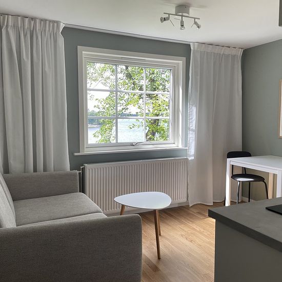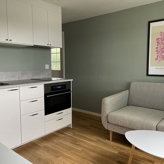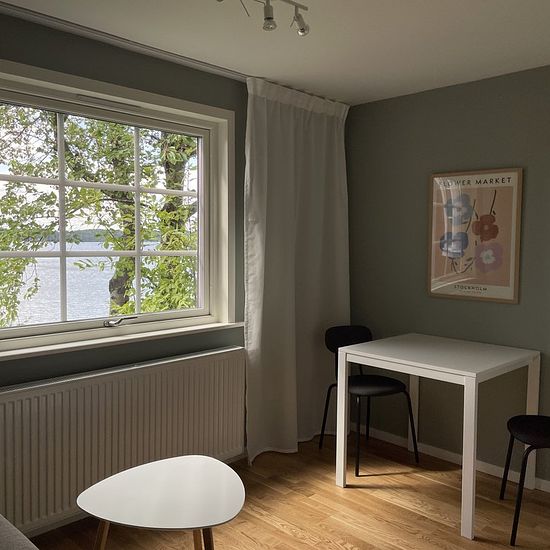 Ny lägenhet med sjöutsikt i eget hus (2a på 25 kvm) Nybyggd och modern lägenhet i en separat byggnad med fantastisk sjöutsikt hyrs ut. Lägenheten är fullt möblerad och det är bara att flytta in. Lägenheten är på 25 kvm består av kök och vardagsrum, badrum med tvätt-och torkmaskin och ett separat sovrum med säng och garderob. Sängen är 160 cm bred. Köket är fullt utrustat med bland annat kyl, frys, diskmaskin, kombinerad ugn och mikro, och häll. Lägenheten ligger längs en återvändsgata i ett lugnt villaområde i Hässelby villastad södra....