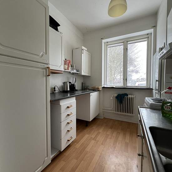 Trevlig och funktionell 2‑rumslägenhet med kök, belägen en halvtrappa. Lägenheten har bra ljusinsläpp, praktisk planlösning och kök med plats för matbord. Vardagsrummet är lättmöblerat och sovrummet erbjuder gott om förvaring. Fastighetsägaren tillhandahåller kostnadsfri vit väggfärg för den som själv vill måla och fräscha upp bostaden Parkering finns att hyra på gården för 200 kr/mån.