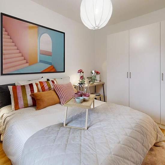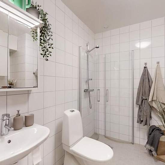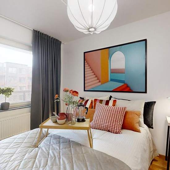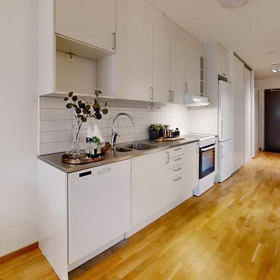 Lägenheten har ett generöst badrum med dusch, handfat, handfat, tvättmaskin och torktumlare. Ytskikten består av kakel och klinkers. Vardagsrummet har en öppen planlösning mot köket och har ett stort ljusinsläpp. Från vardagsrummet når du balkongen. Hallen har förrådet, klädkammare och ingång till badrum och sovrum. Ytskikten är vita och ljusa och består av målade väggar, ekparkett, vita köksluckor och grå laminatbänkskiva. Maskinparken består av kyl, frys, diskmaskin, spis, och spisfläkt. Fastigheten är kopplad mot det öppna stadsnätet,...