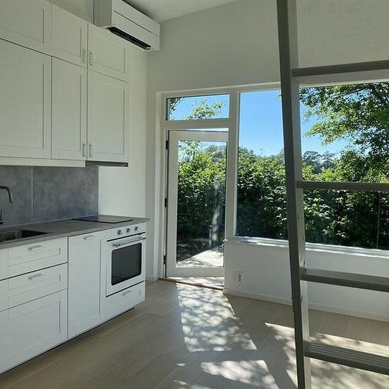 Komplett Attefallshus från 2022 för åretruntboende uthyres! 30 kvm + sovloft Arkitektdesignat, modernt och energieffektivt Attefallshus på 30 kvm plus sovloft uthyres. Huset har ett separat sovrum, en kök/vardagsrumsdel, ett badrum, en hall och ett sovloft. Till huset finns både trädgård, trädäck och parkering. Sovrum: Separat sovrum på ca 7 kvm. Högt i tak och plats för våningssäng, loftsäng och förvaring. Två små fönster. Hall: Man kommer in i en hall på ca 2 kvm med plats för ytterkläder och mindre byrå under loftstegen som fin...
